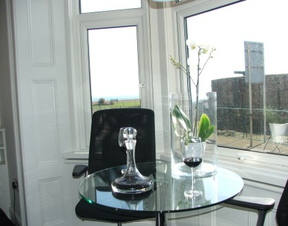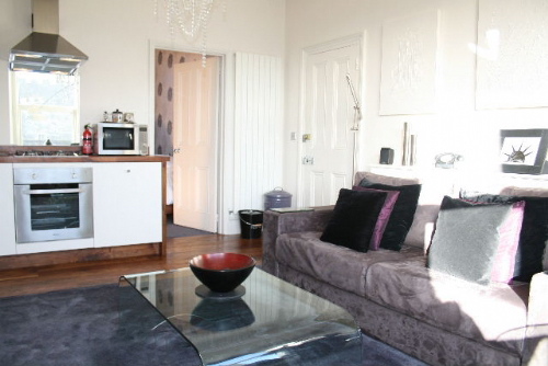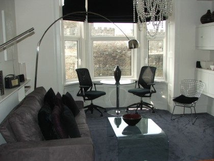 Open plan lounge, kitchen, diner with views to the Sea and Castle. There is a feature original fireplace, chandelier high ceilings, with traditional cornice and coving. Flatscreen TV with DVD. The bedroom with double bed has a flatscreen TV with DVD. There is a small lobby with wardrobe and small changing area. The quality bathroom has bath with shower over, w/c and basin.